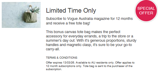March Mag of the Month: Vogue AustraliaWin a $50 Voucher!Where global runway meets Australian style, Vogue Australia sets the agenda for what’s next in fashion and culture. Subscribe to Vogue Australia this March for your chance to WIN a $50 isubscribe Voucher! Why subscribe?